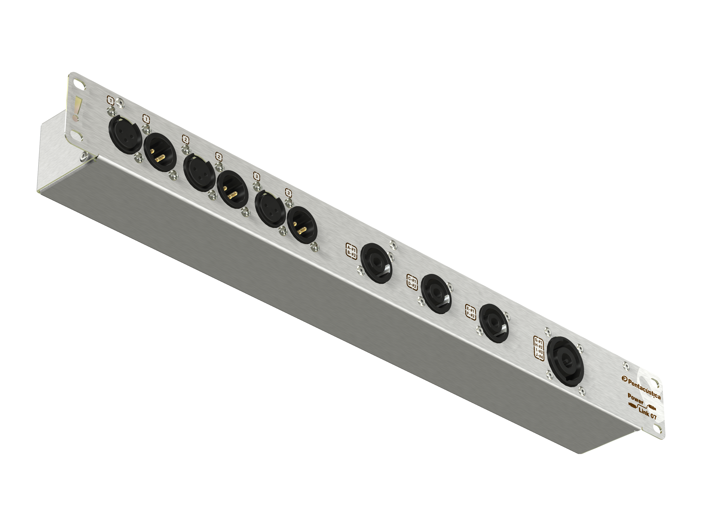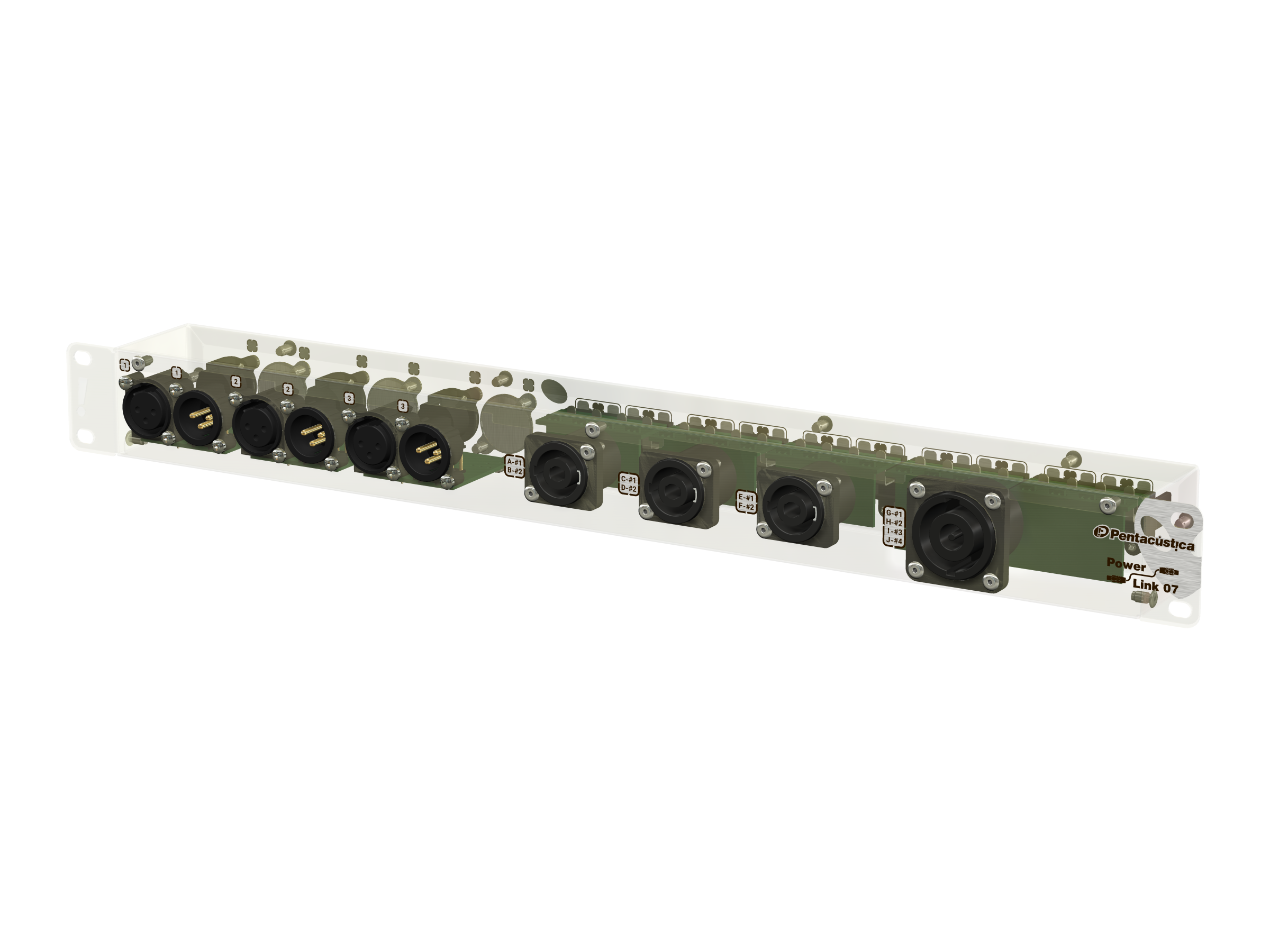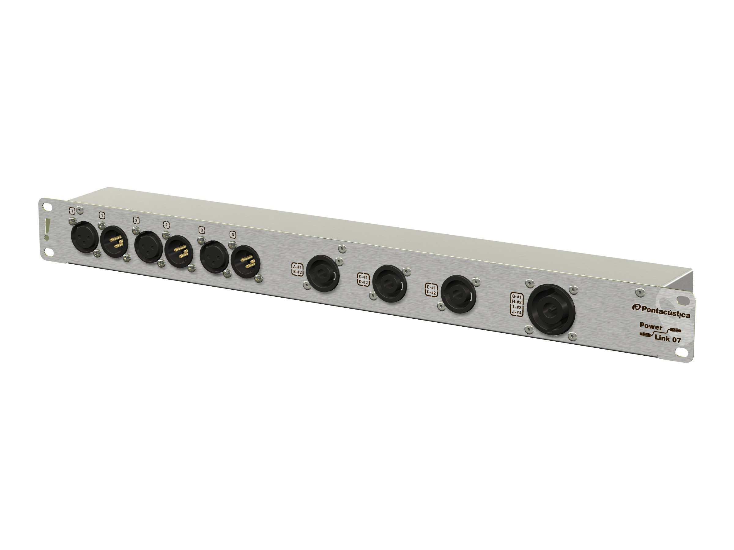3 canais independentes para sinais de linha com conexões XLR-3: Entrada e link frontais e uma saída traseira.