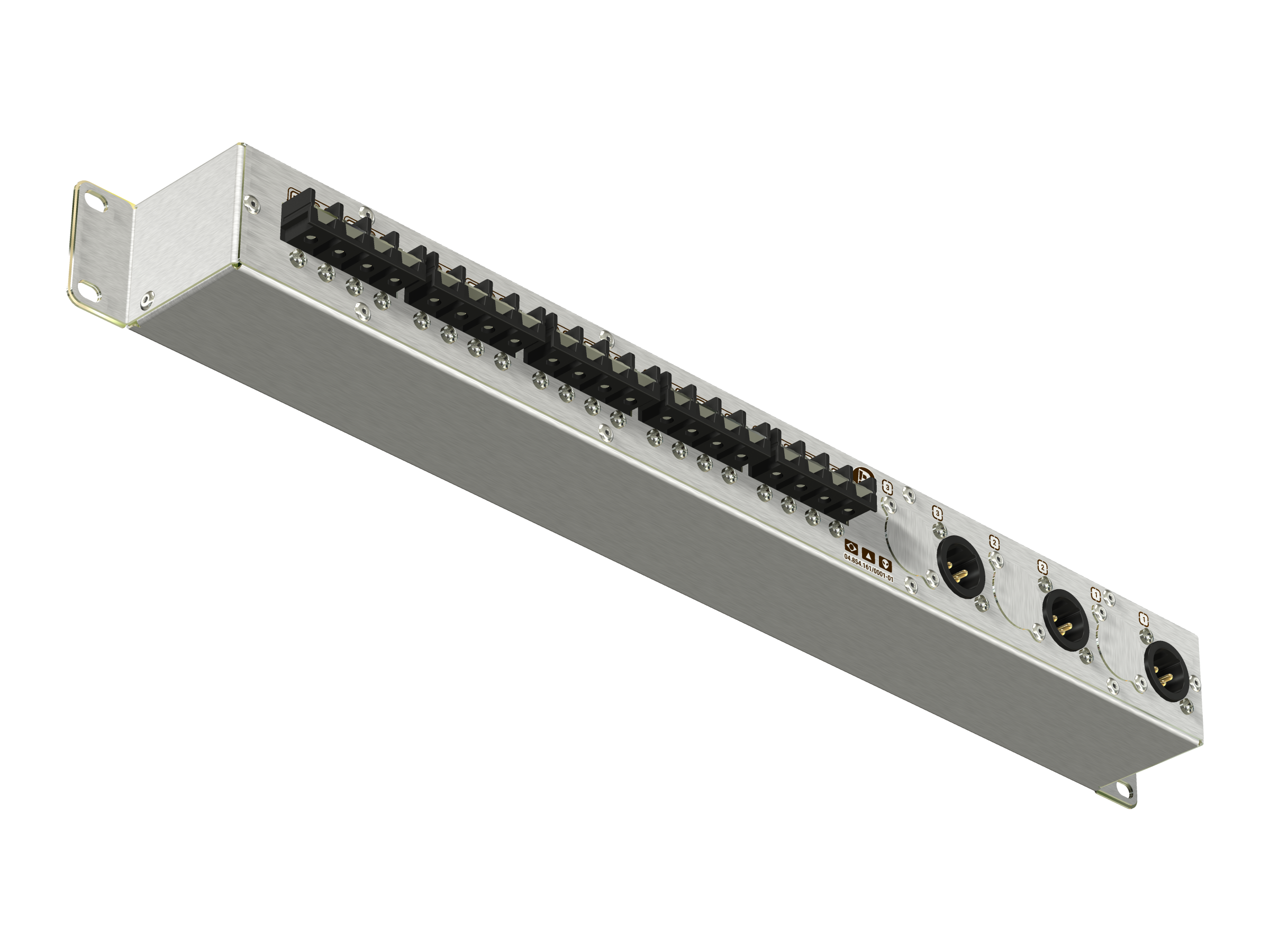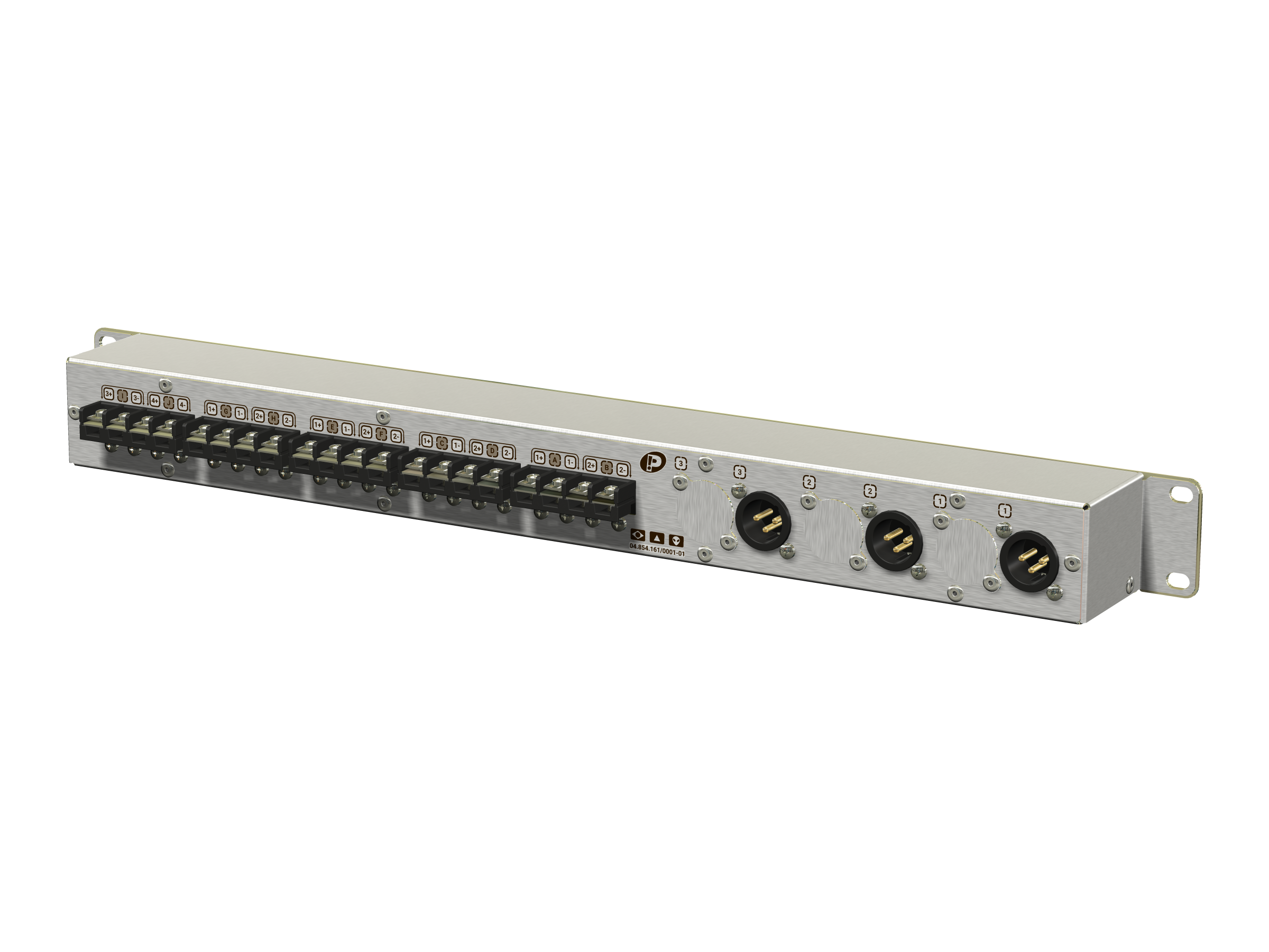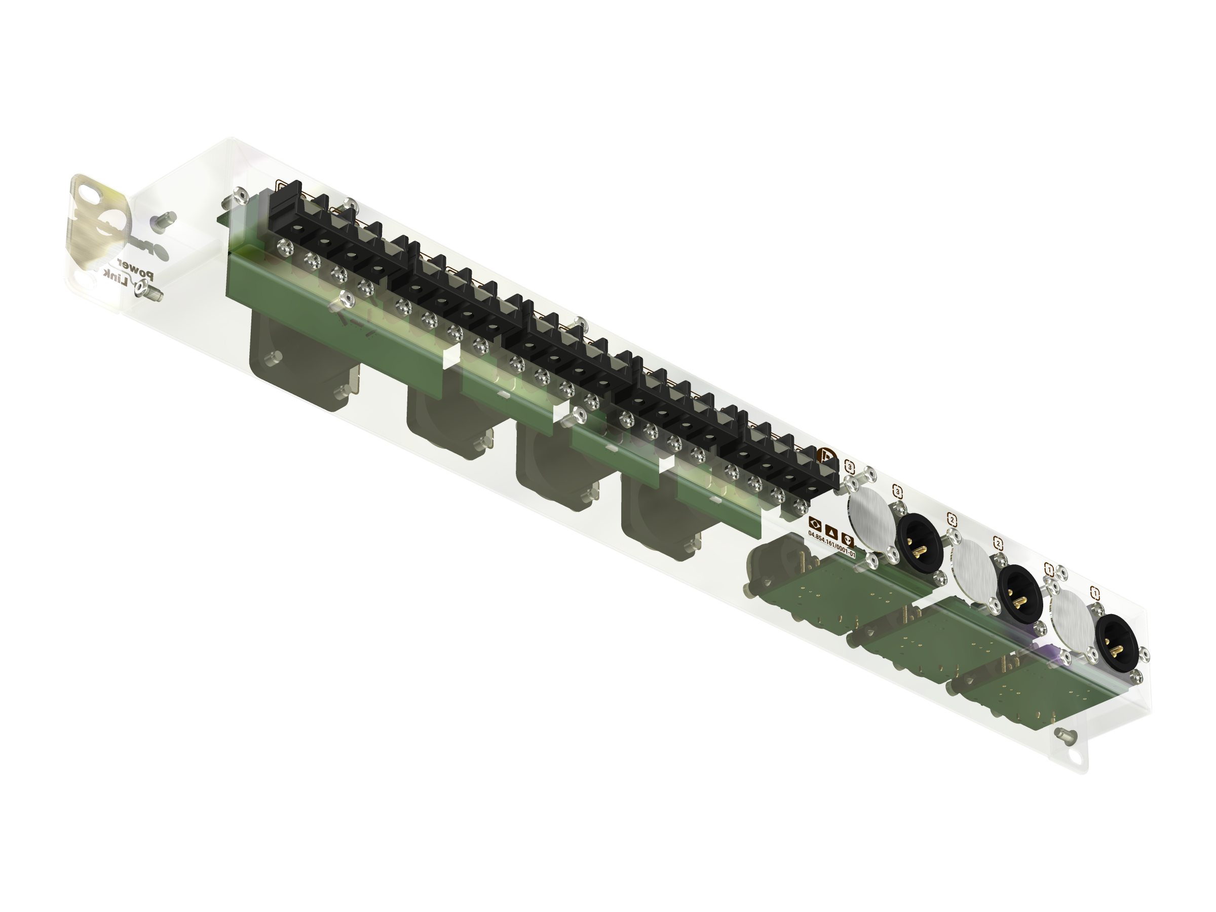 3 canais independentes para sinais de linha com conexões XLR-3: Entrada e link frontais e uma saída traseira.